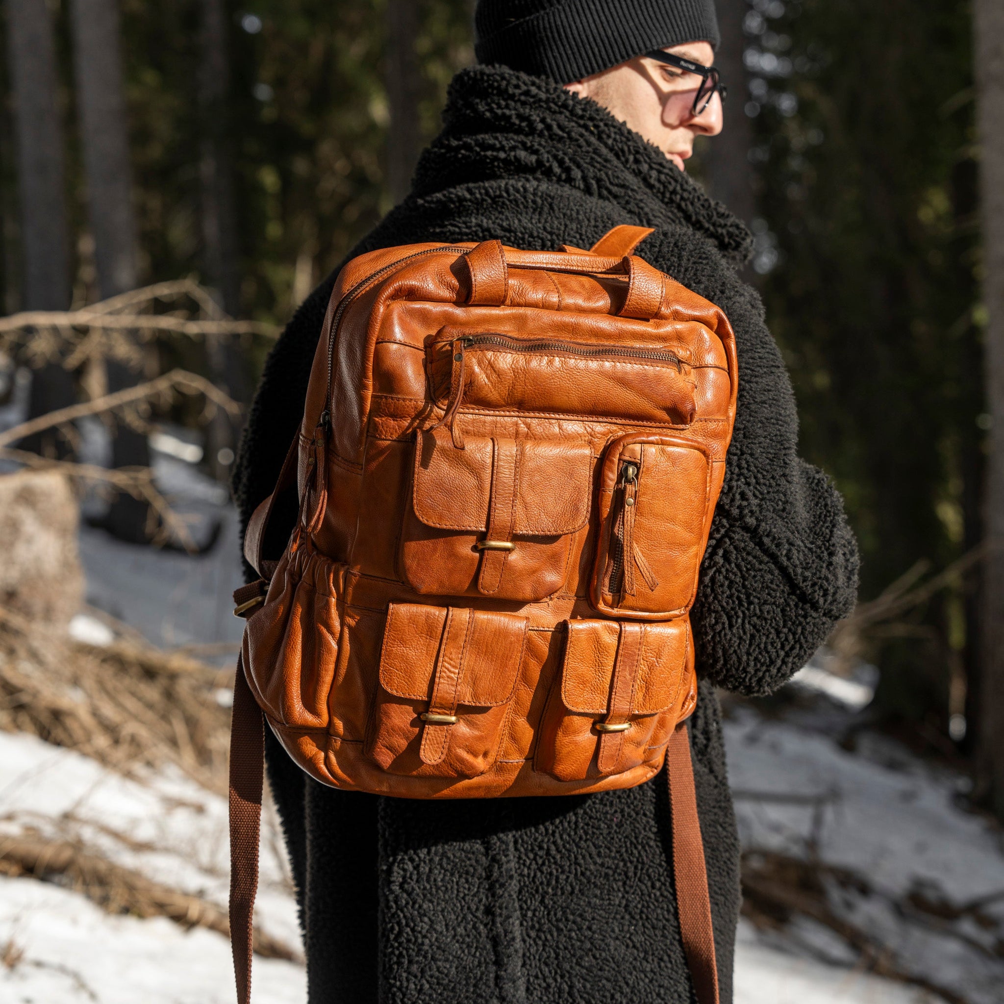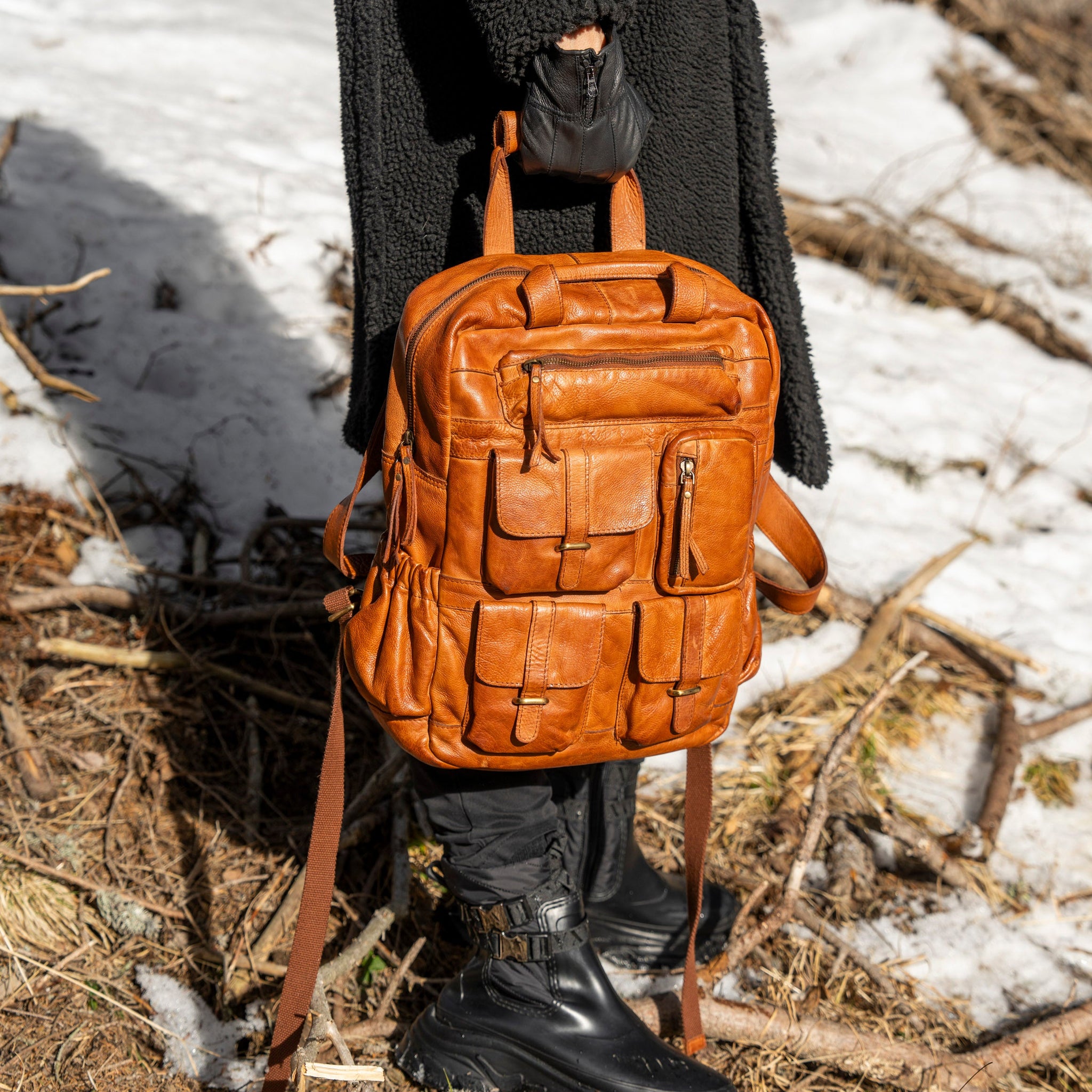 Zaino in pelle lavata multitasche, si distingue per il suo carattere grintoso e vintage. La pelle lavata gli dona una texture morbida e vissuta valorizzata dagli accessori in metallo spazzolato. Il design urban-chic è arricchito da numerose tasche esterne che aggiungono stile e offrono una soluzione pratica per l'organizzazione. Lo zaino ha un grande scomparto principale con chiusura a cerniera e un porta laptop imbottito, due tasche esterne laterali elasticizzate perfette per trasportare borraccia e ombrello. Lo schienale è imbottito e traspirante, gli spallacci morbidi e regolabili, la maniglia superiore è ideale per trasportarlo a mano.