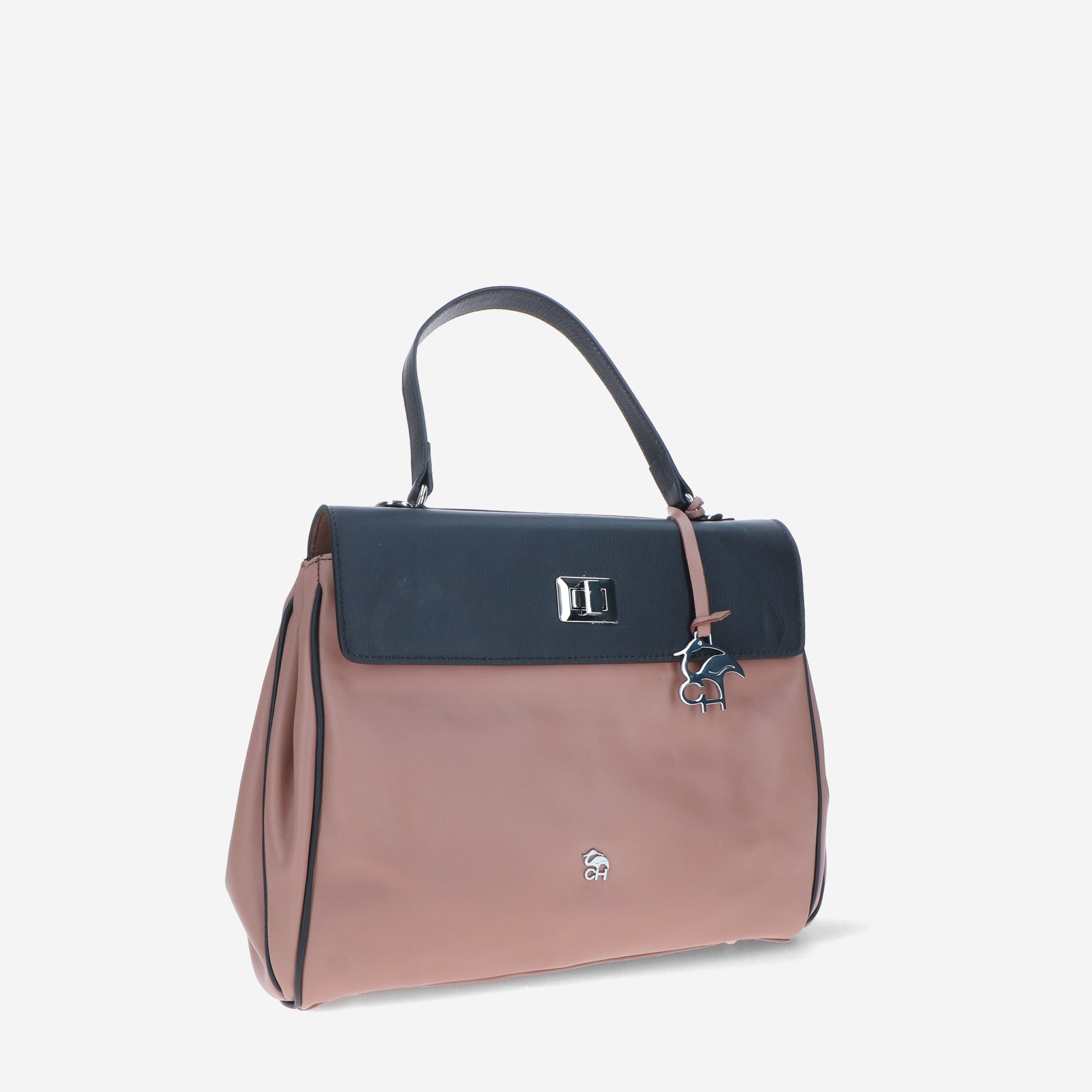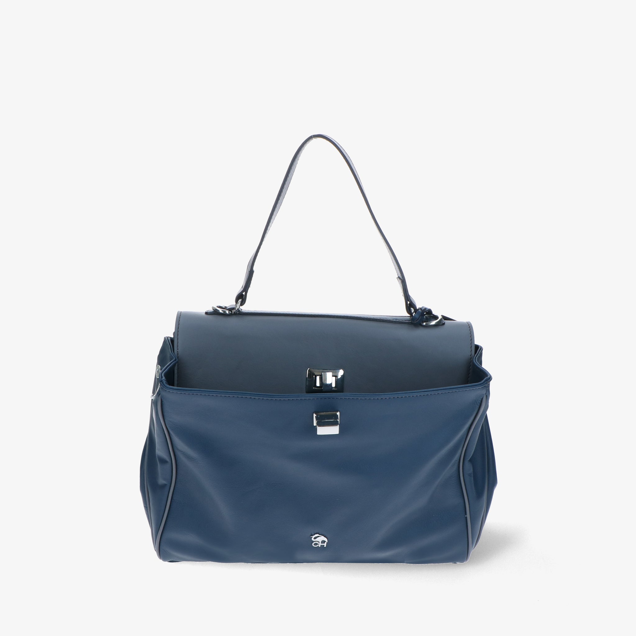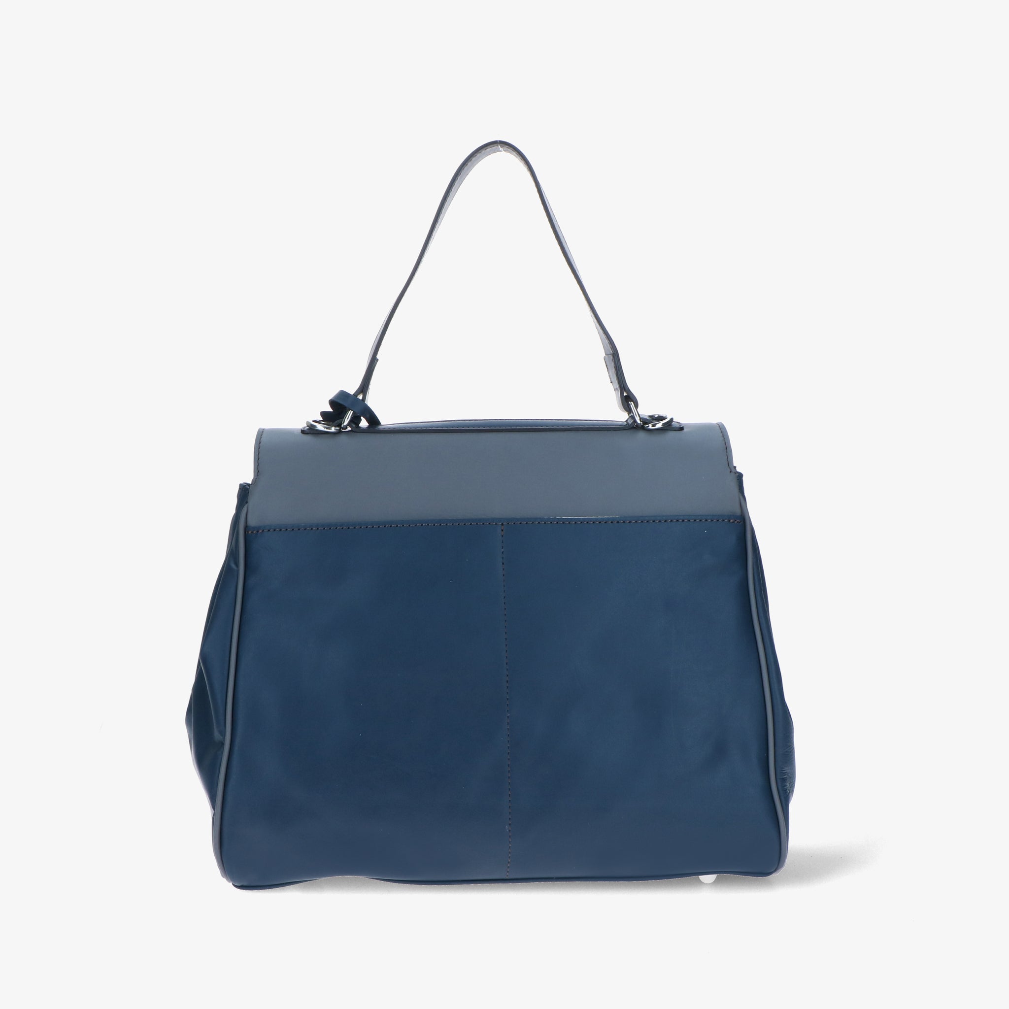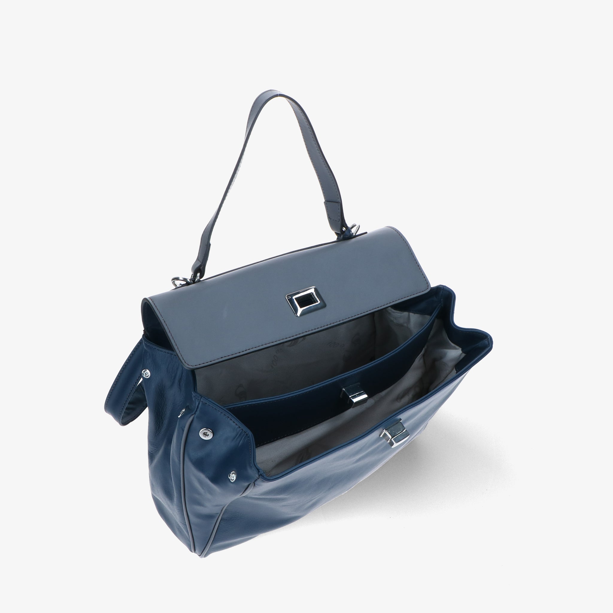 Borsa a spalla in pelle liscia e morbida, dal design elegante e strutturato. La patta si aggancia a due girelli twist-lock: quello interno chiude il primo scomparto, quello esterno racchiude entrambi, per una gestione pratica dei contenuti. L’interno foderato è suddiviso in due vani con tasche organizzative; sul retro, due tasche esterne permettono di tenere a portata di mano gli oggetti di uso frequente. Un modello versatile che unisce funzionalità e stile.