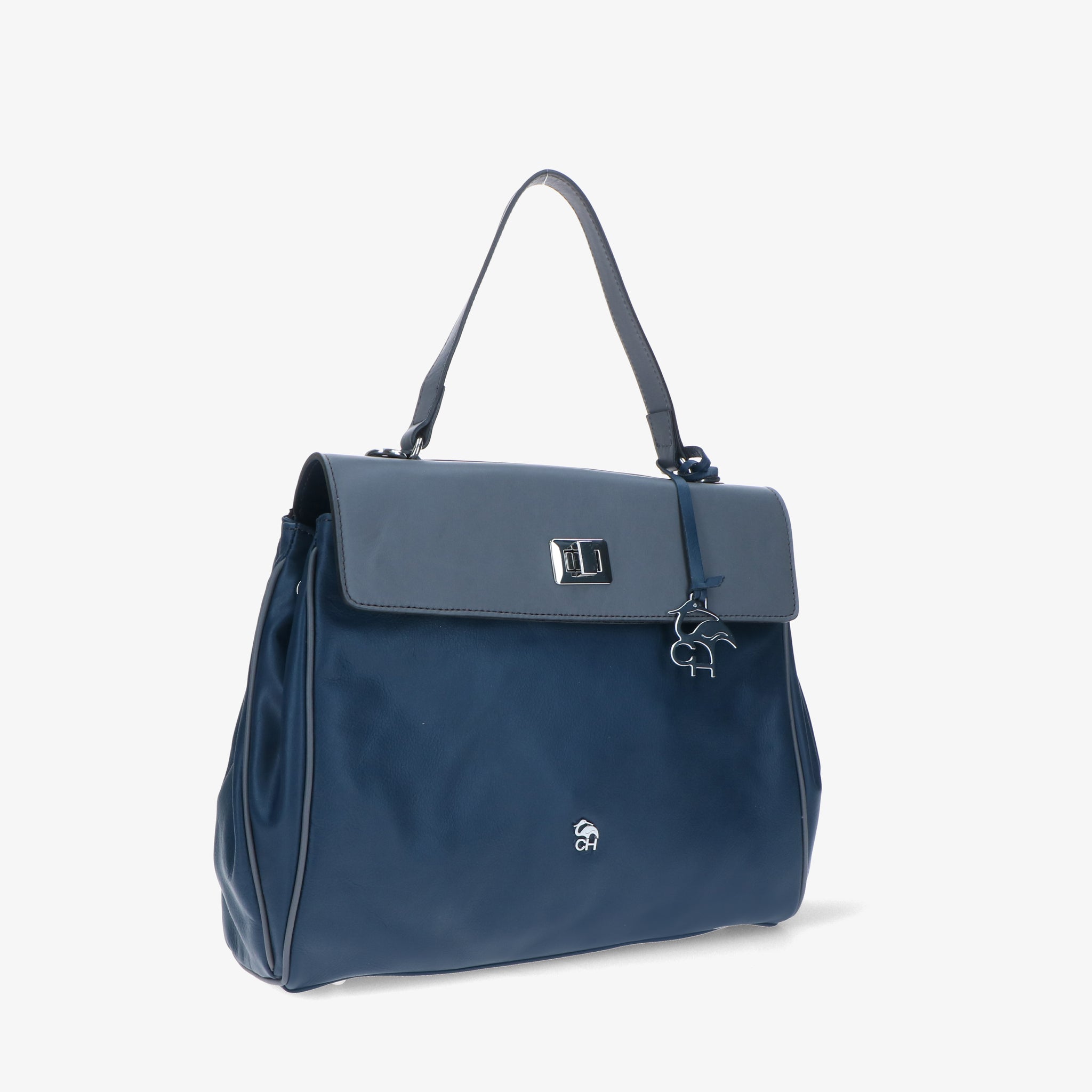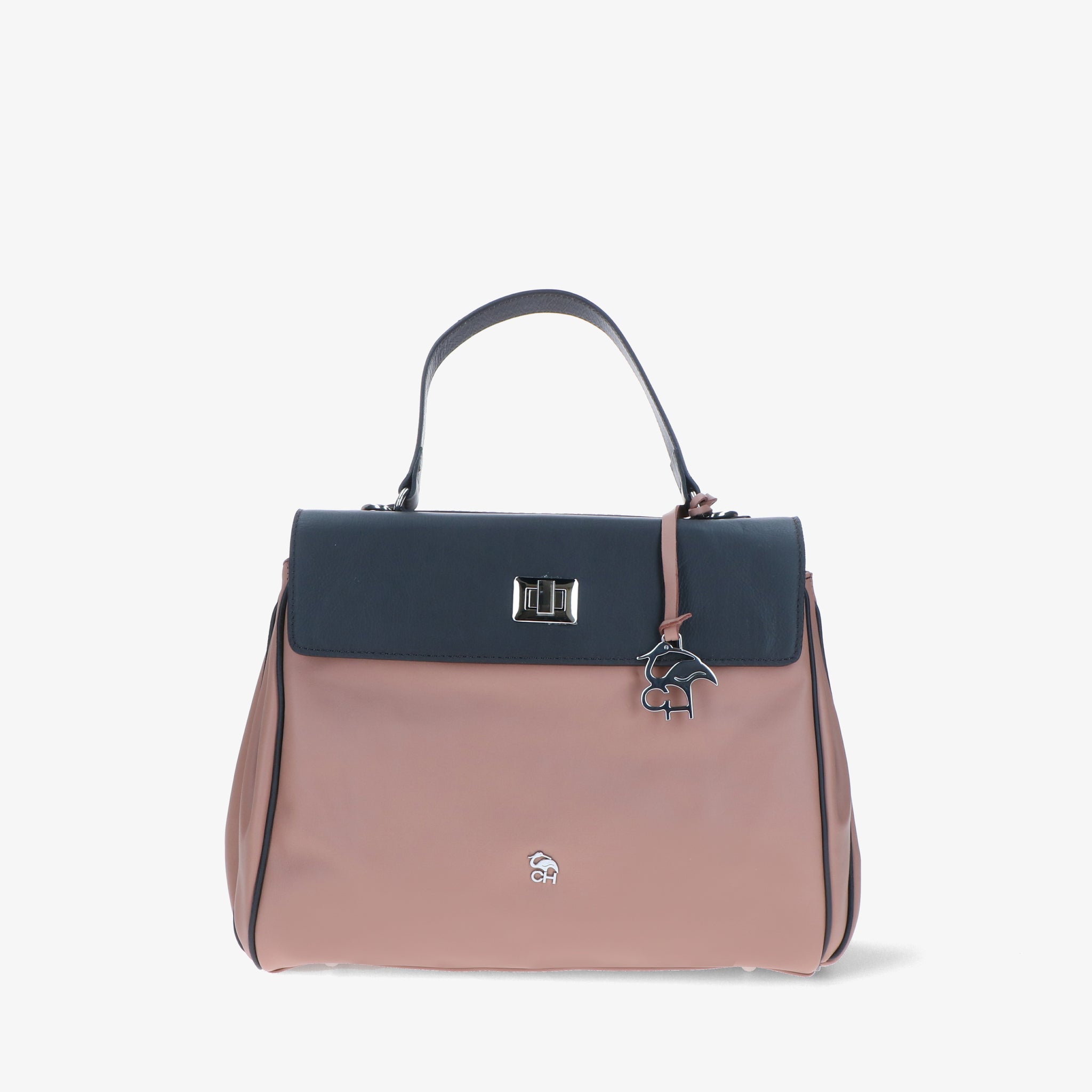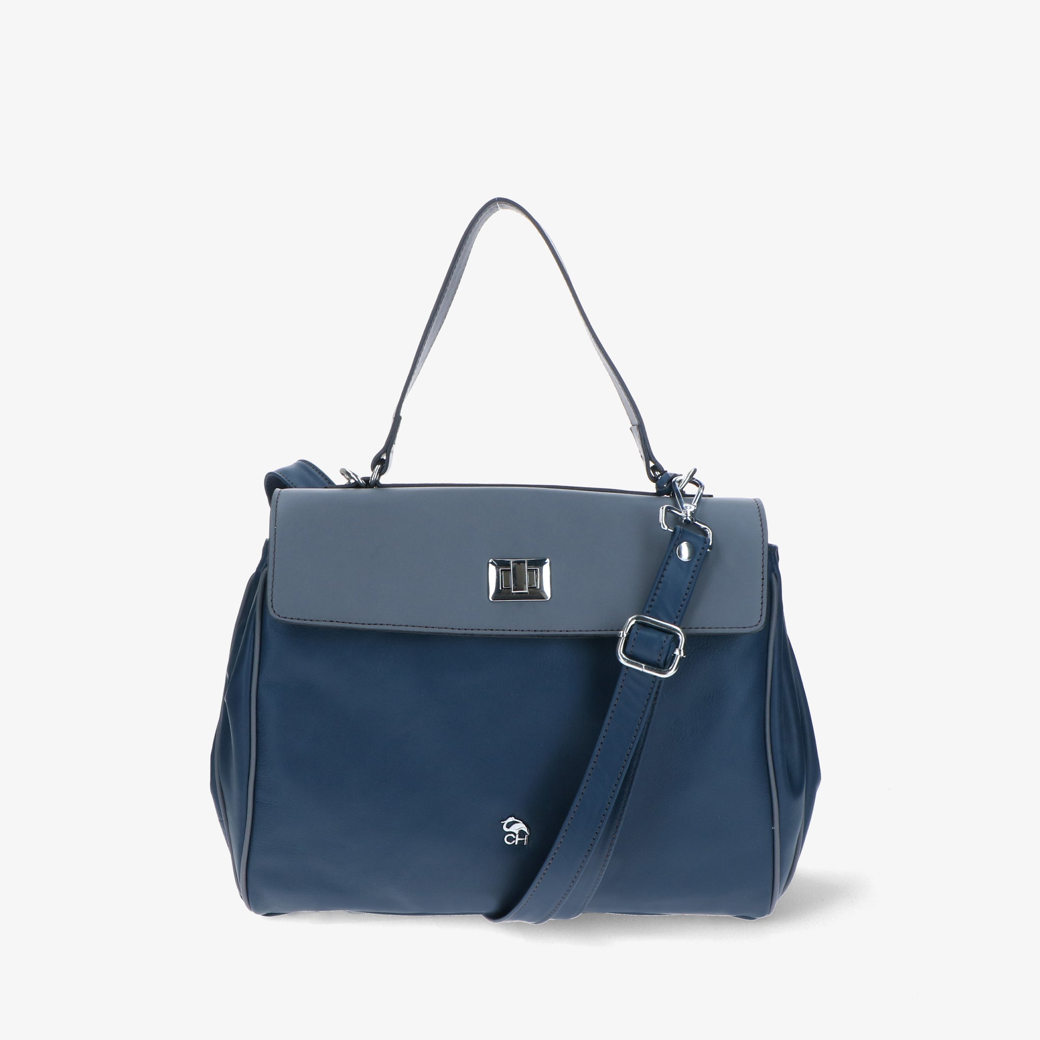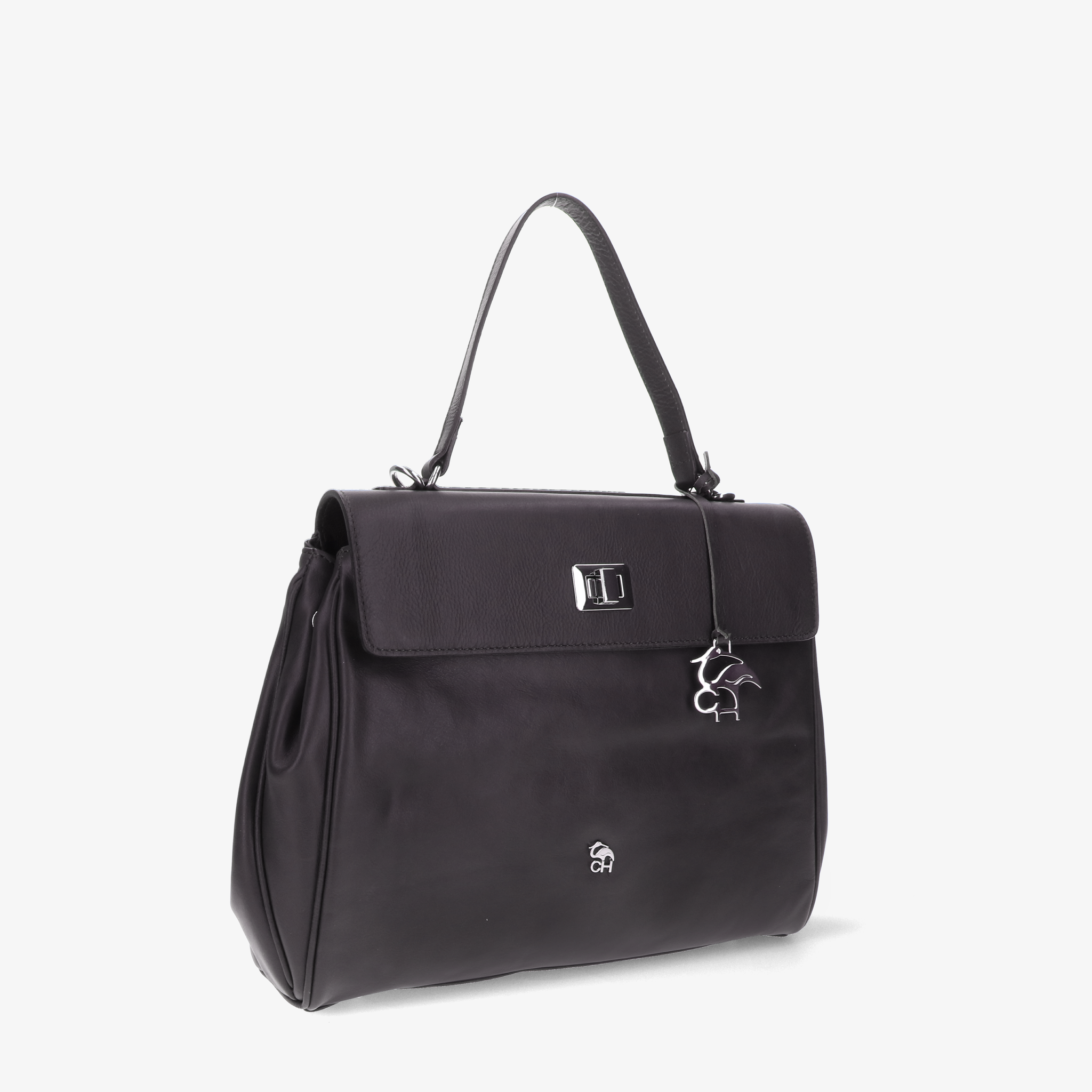 Borsa a spalla in pelle liscia e morbida, dal design elegante e strutturato. La patta si aggancia a due girelli twist-lock: quello interno chiude il primo scomparto, quello esterno racchiude entrambi, per una gestione pratica dei contenuti. L’interno foderato è suddiviso in due vani con tasche organizzative; sul retro, due tasche esterne permettono di tenere a portata di mano gli oggetti di uso frequente. Un modello versatile che unisce funzionalità e stile.