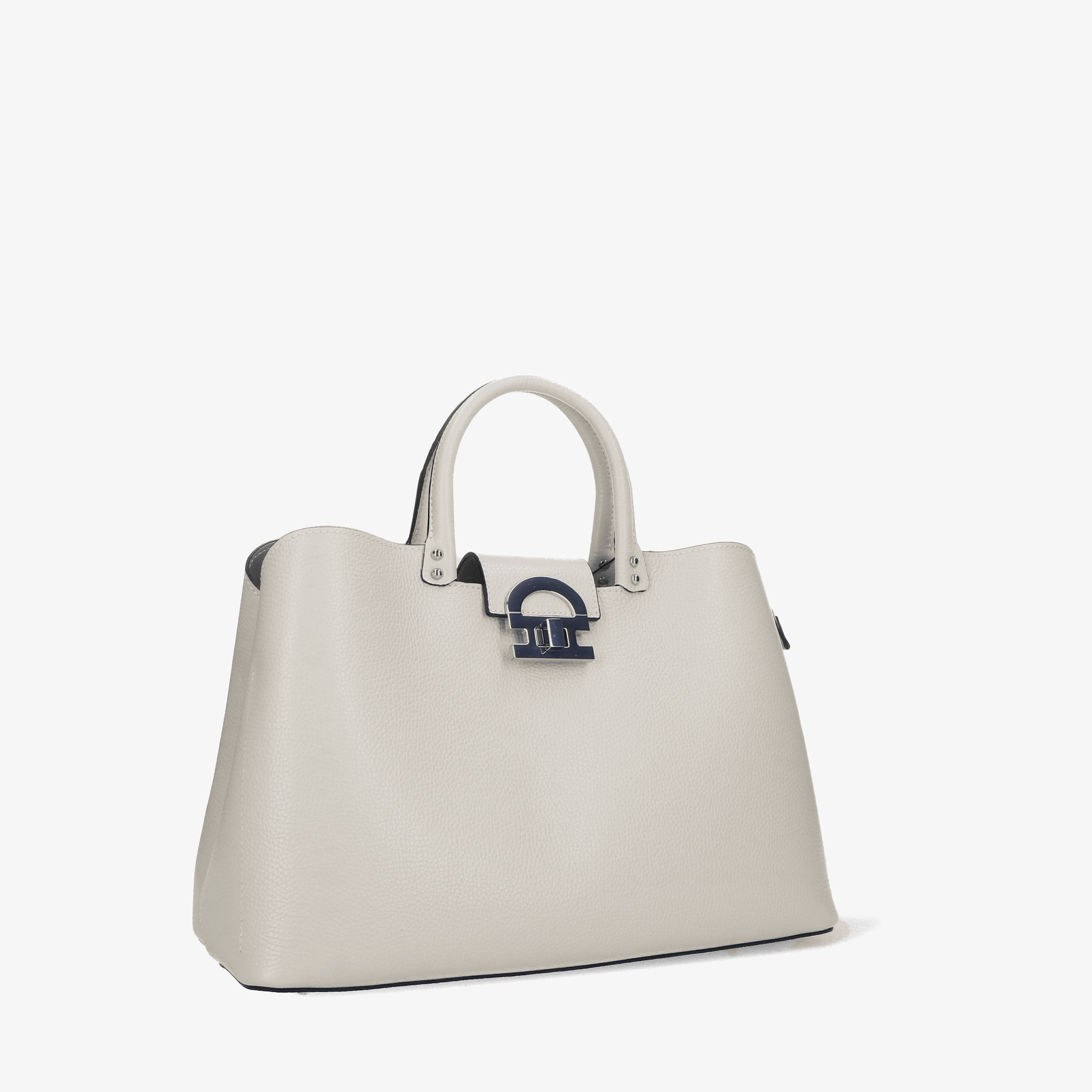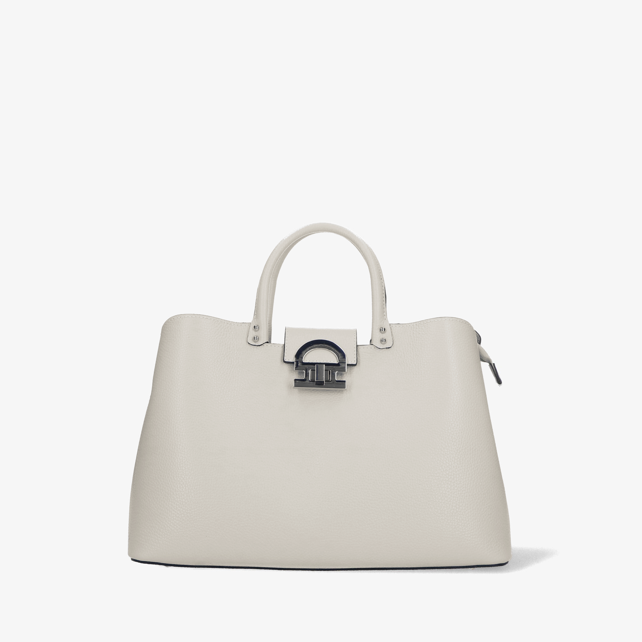 Handtasche aus gehämmertem Leder mit eleganter und markanter Silhouette. Sie öffnet sich mit einem zentralen Reißverschluss und verfügt über zwei Seitenfächer mit Magnetverschluss für praktische und diskrete Aufbewahrung. Das vordere Lederband ist mit dem CH-Drehverschluss verziert, Charlottes ikonischem Detail, das das minimalistische Design unterstreicht. Mit zwei Tragegriffen und einem verstellbaren und abnehmbaren Schultergurt vereint sie Funktionalität und Stil mit einem modernen Touch.