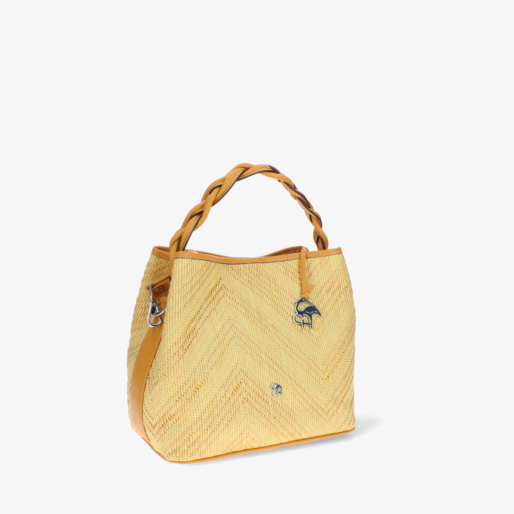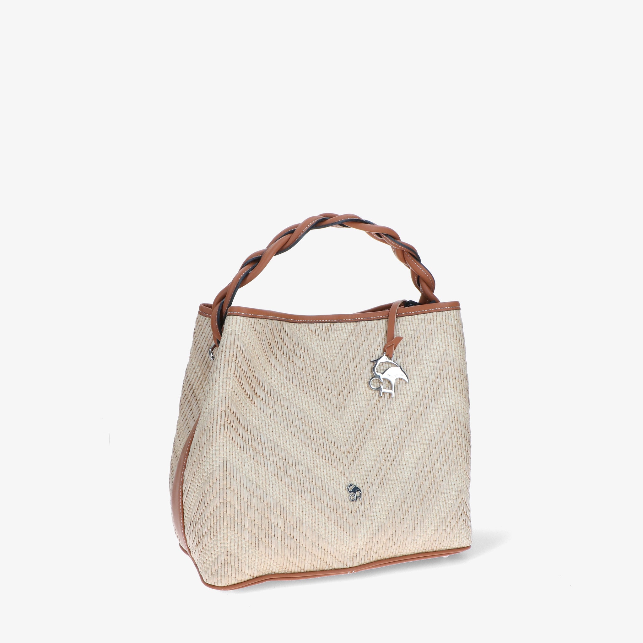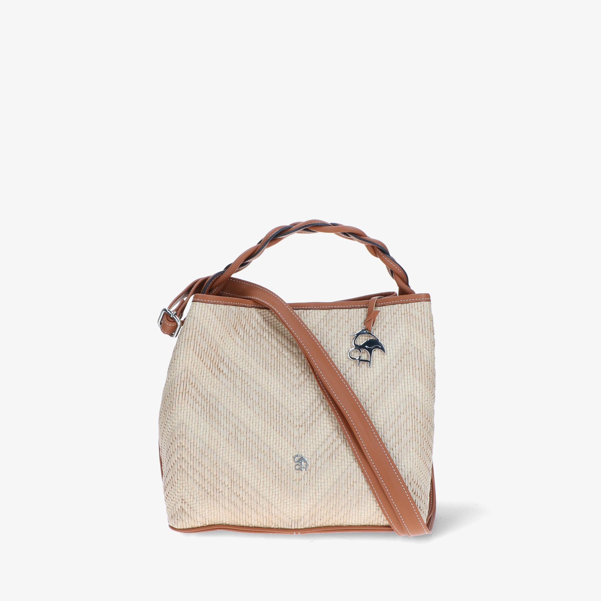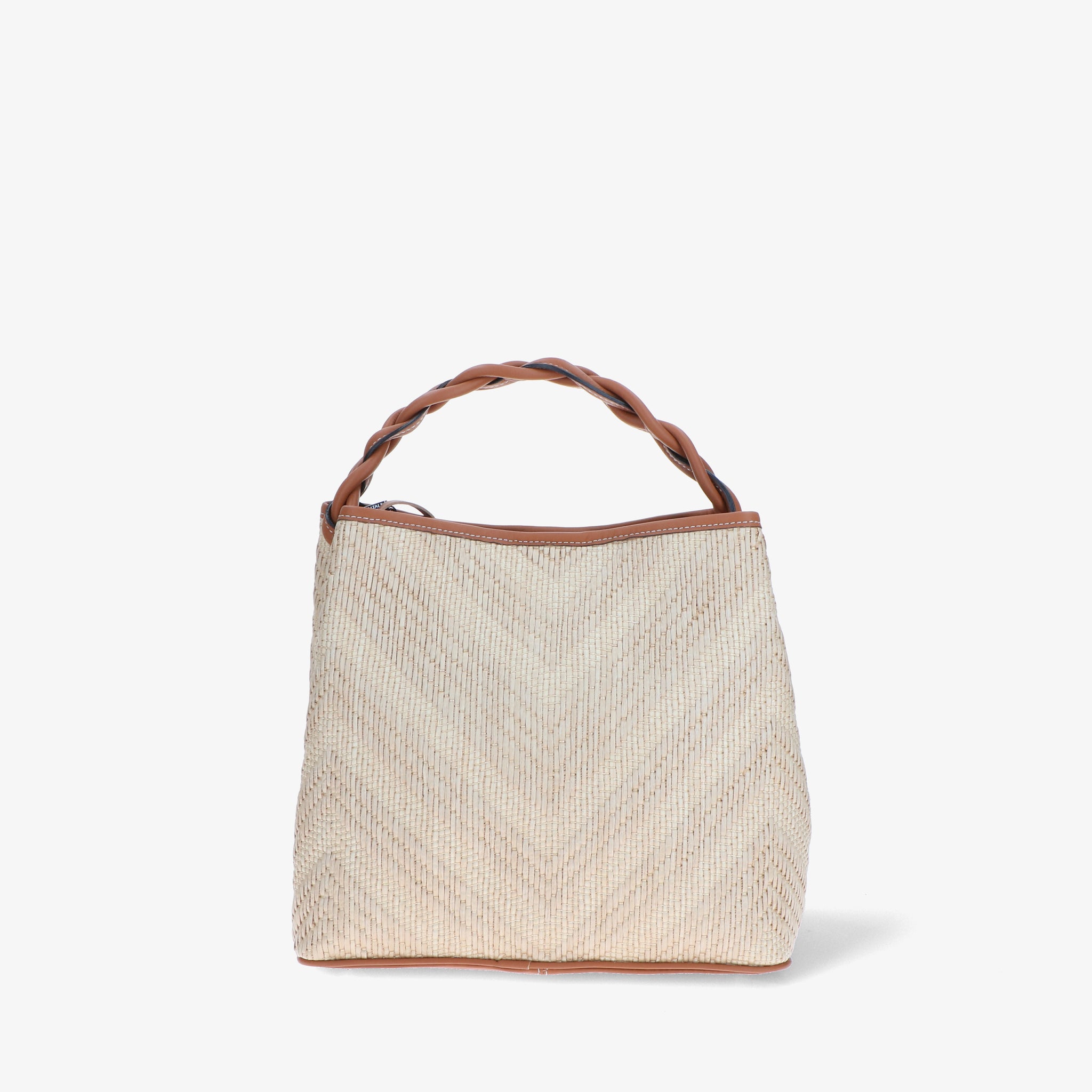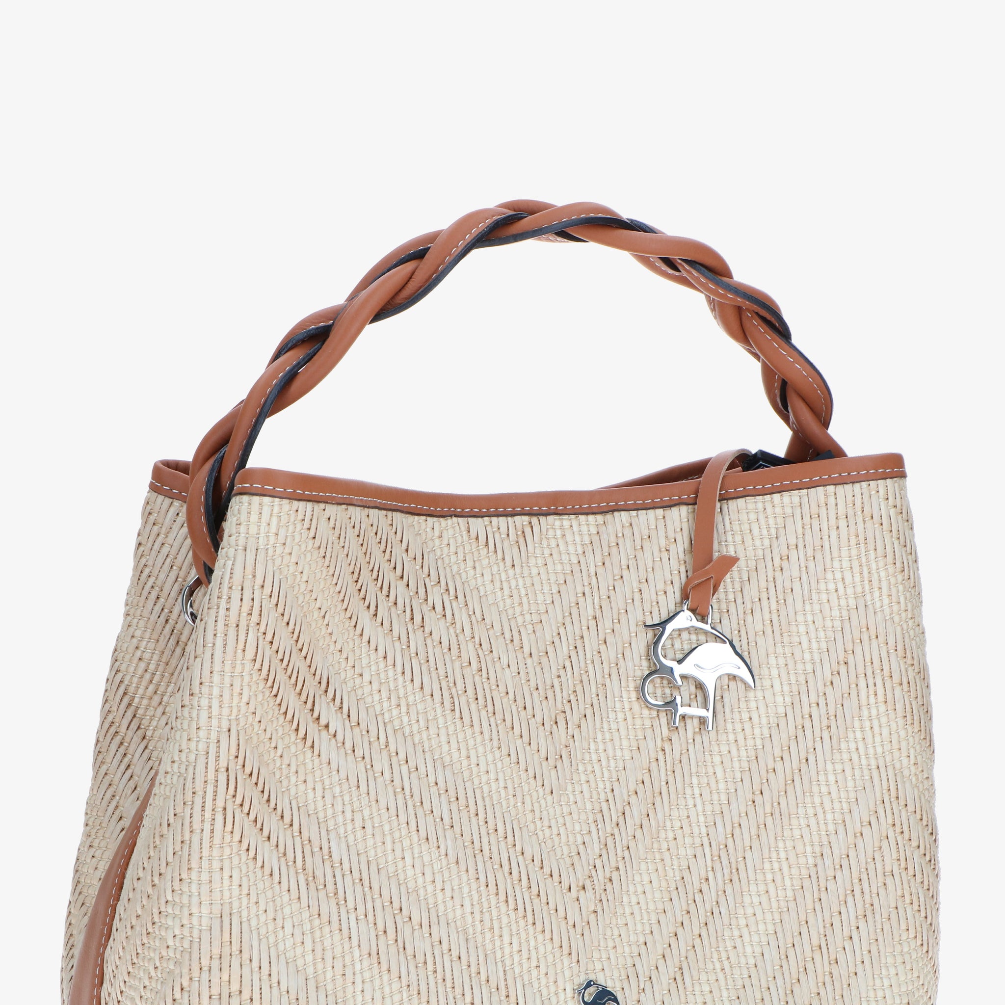 Elegante und moderne Handtasche aus Bast und Leder. Der geflochtene Ledergriff verleiht einen skulpturalen und markanten Touch, während die Baststruktur an die Sommeratmosphäre erinnert. Das geräumige und funktionelle Innere ist darauf ausgelegt, alles, was Sie brauchen, ordentlich aufzubewahren. Der verstellbare Schulterriemen macht sie noch vielseitiger und perfekt, um Sie stilvoll durch den Tag zu begleiten.