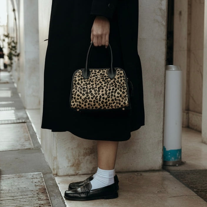 Kompakte Handtasche aus natürlichem Kalbsleder mit Animalprint-Details. Die weichen Linien und die strukturierten Doppelgriffe unterstreichen den modernen und markanten Stil. Der gefütterte Innenraum mit seinen Fächern und dem Reißverschluss sorgt für Funktionalität, ohne auf Eleganz zu verzichten. Eine Tasche, die die Persönlichkeit ihrer Trägerin zum Ausdruck bringt.