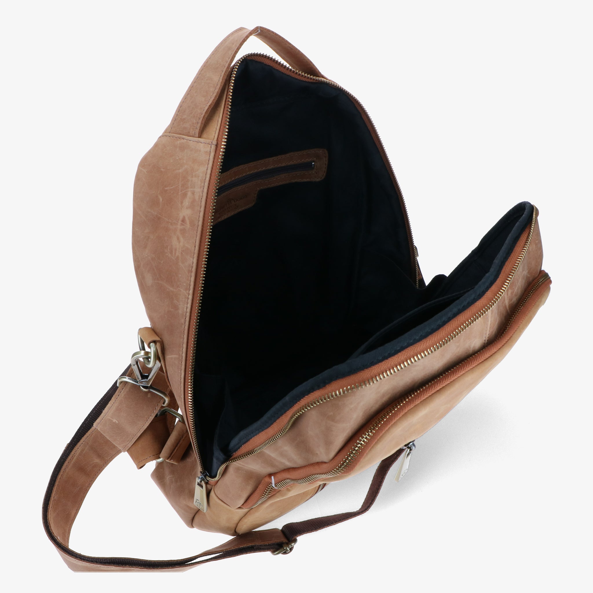 Ein kompakter und funktionaler Rucksack für alle, die zwischen Arbeit, Reisen und Alltag pendeln. Gefertigt aus natürlich geöltem Rindsleder, entwickelt er sich mit der Zeit und offenbart einzigartige Nuancen und Texturen. Der Innenraum ist gut organisiert: ein großes Hauptfach mit Taschen, eine obere Öffnung mit Zwei-Wege-Reißverschluss, eine vertikale Vordertasche und eine versteckte Gesäßtasche. Verstellbare Schultergurte und ein Tragegriff runden den praktischen Nutzen ab.