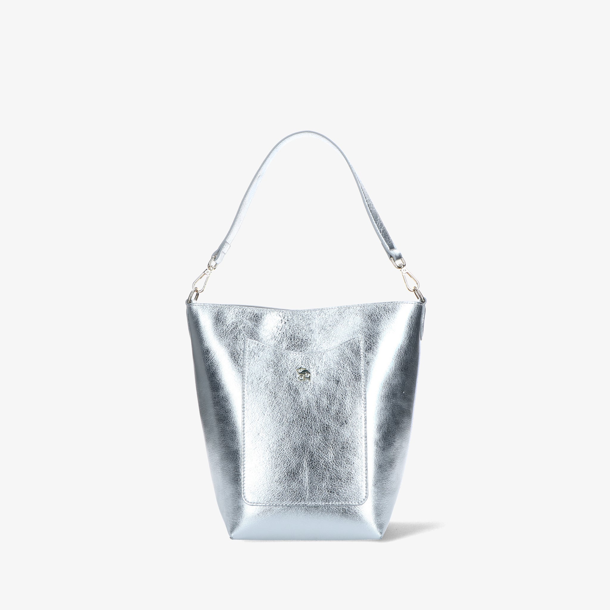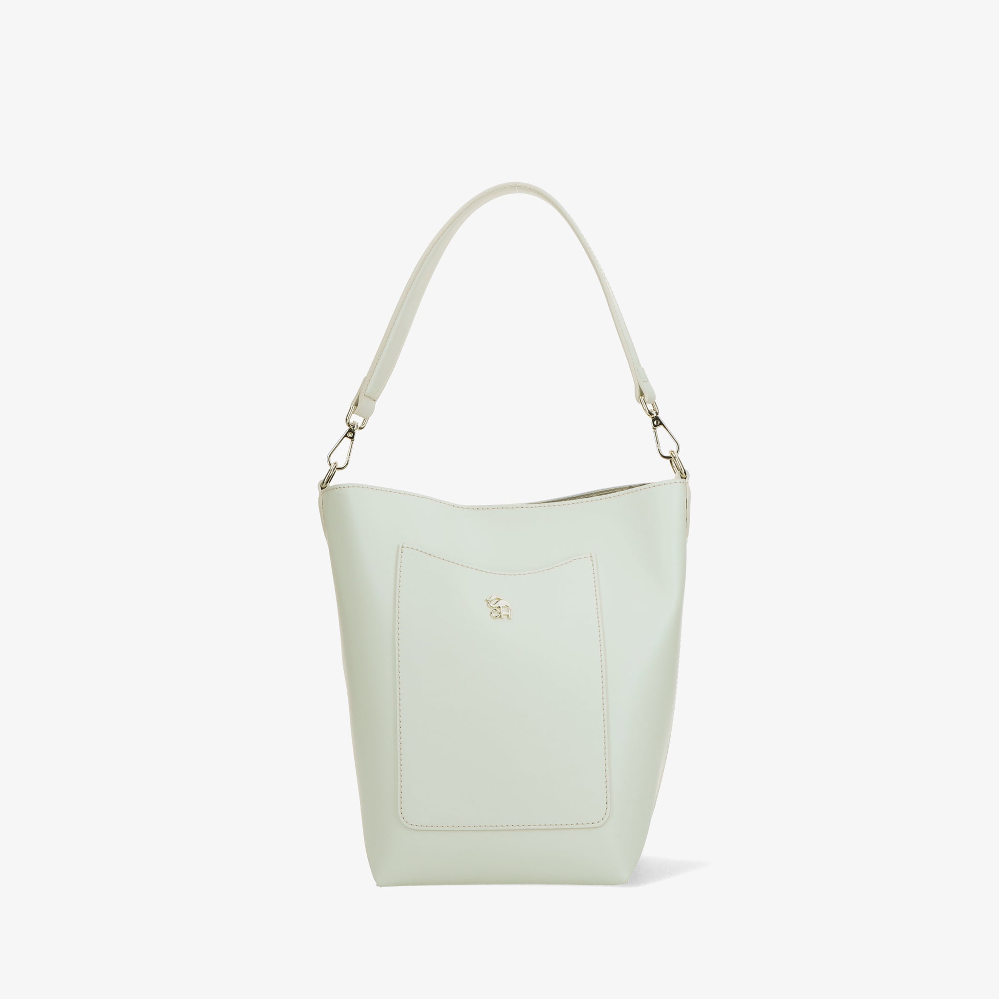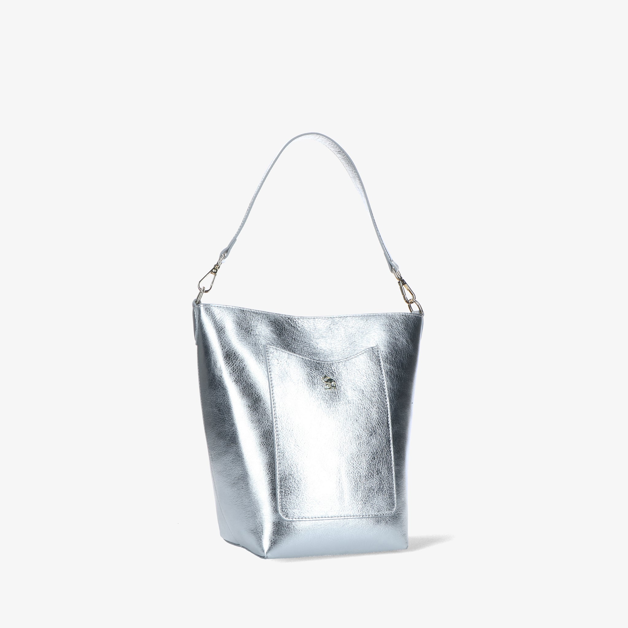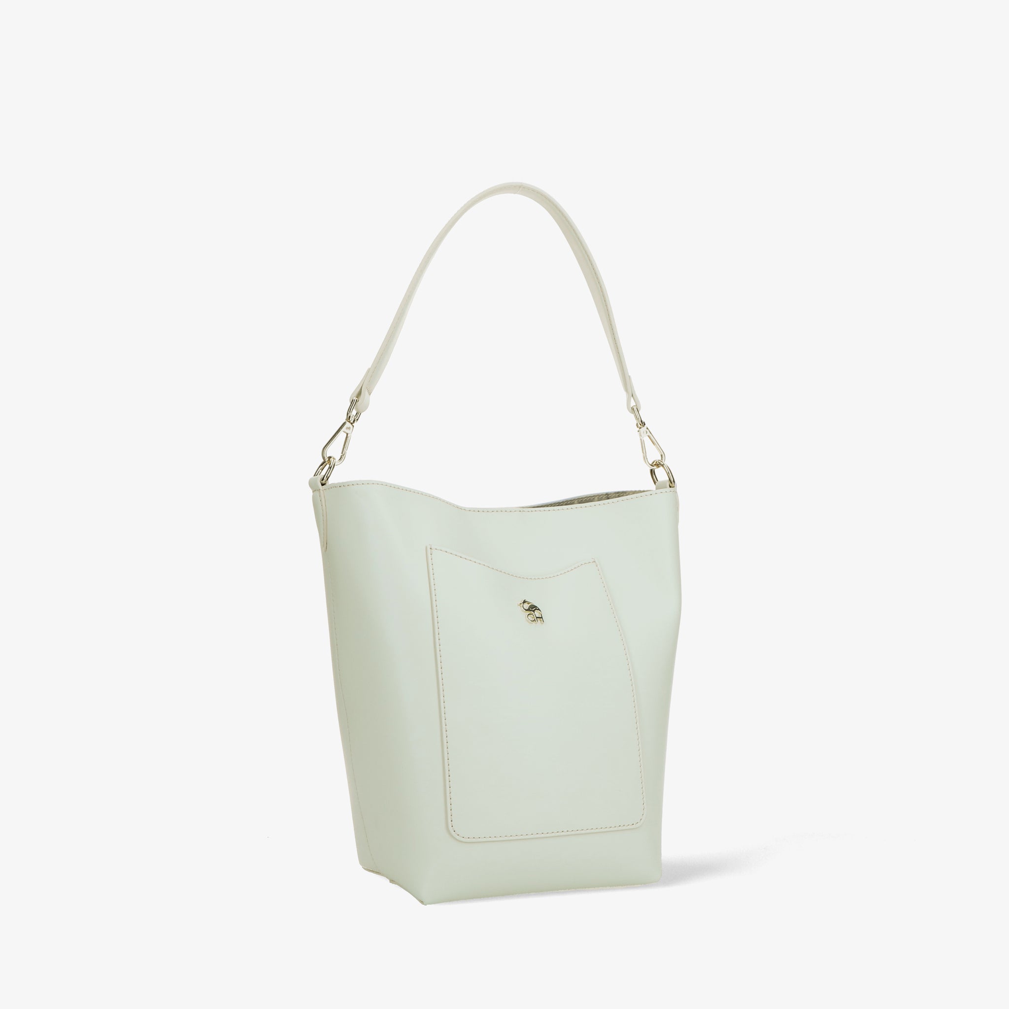 Bucket bag, crafted from brushed calfskin with a smooth, luminous finish. The clean, crisp cut enhances the compact shape, which is given a dynamic touch by the slightly funnel-shaped construction. The short handle and adjustable shoulder strap offer a practical and elegant dual-use option. The well-organized interior features a magnetic closure and functional pockets. Finished with contrasting stitching and a metal logo.