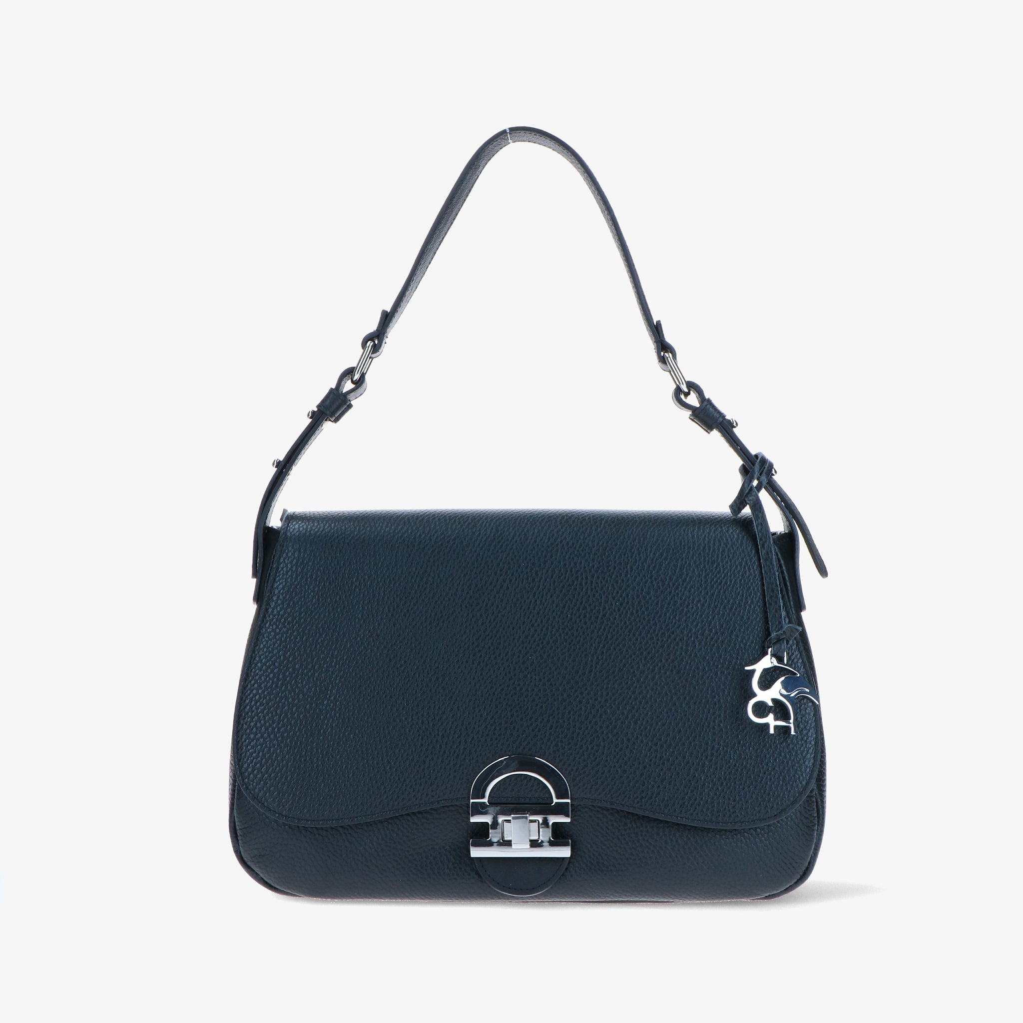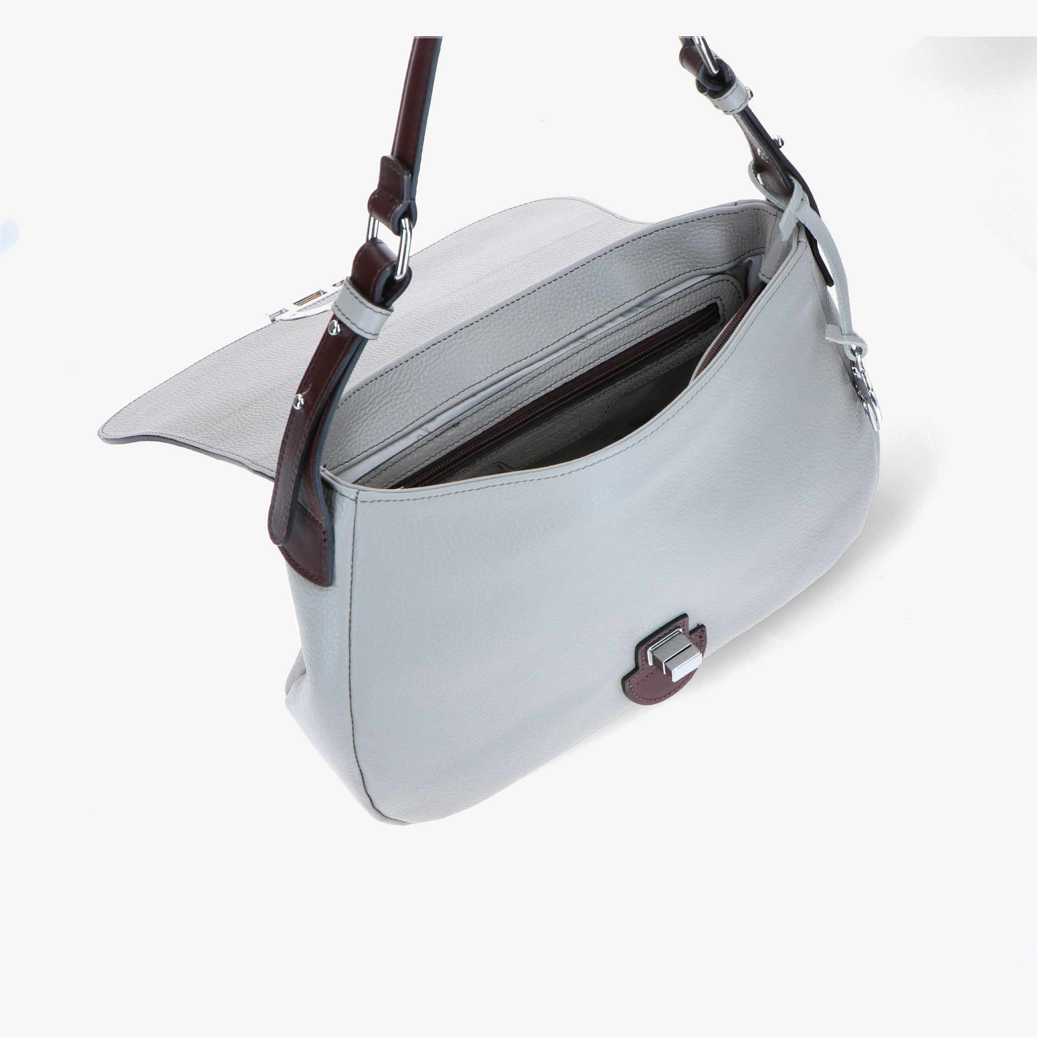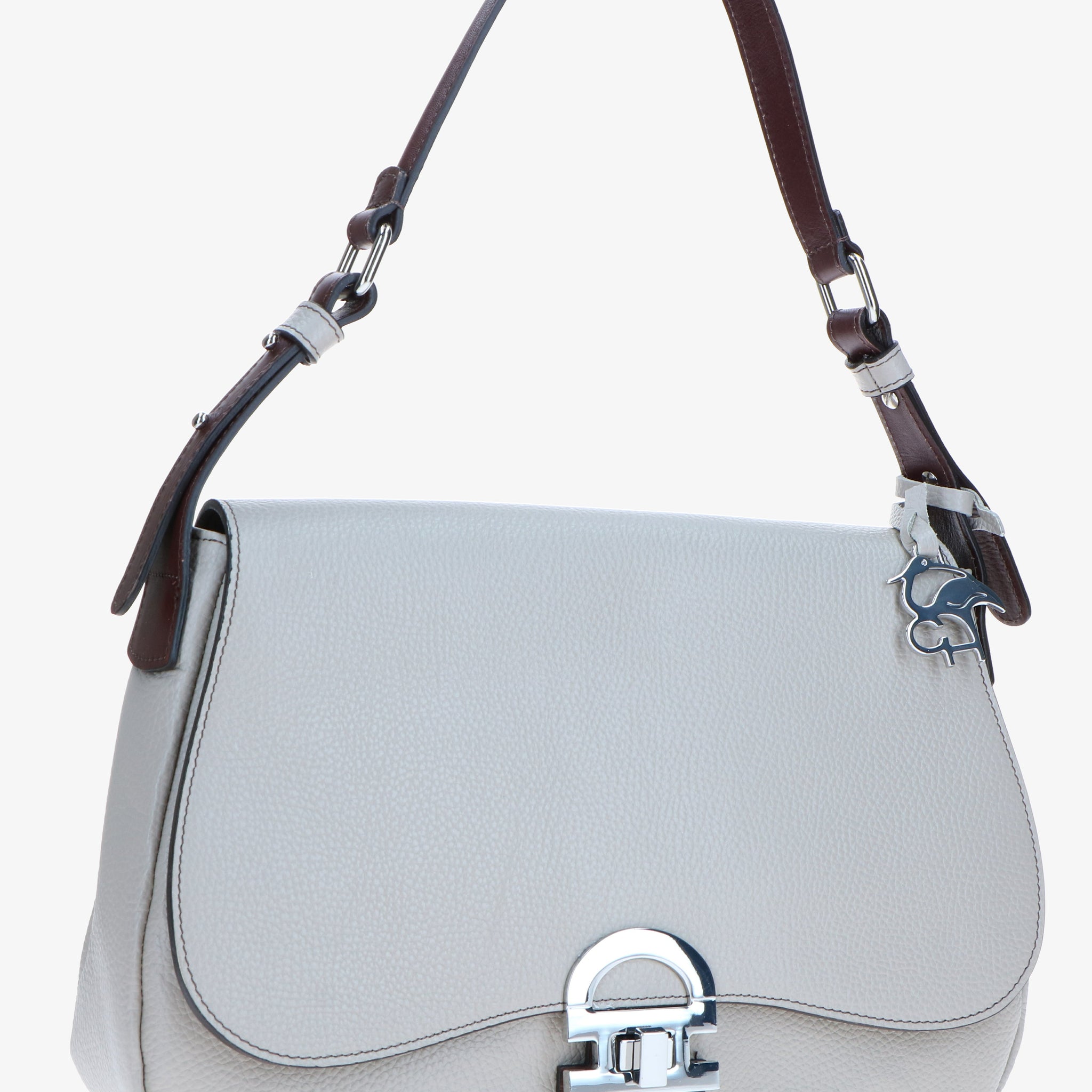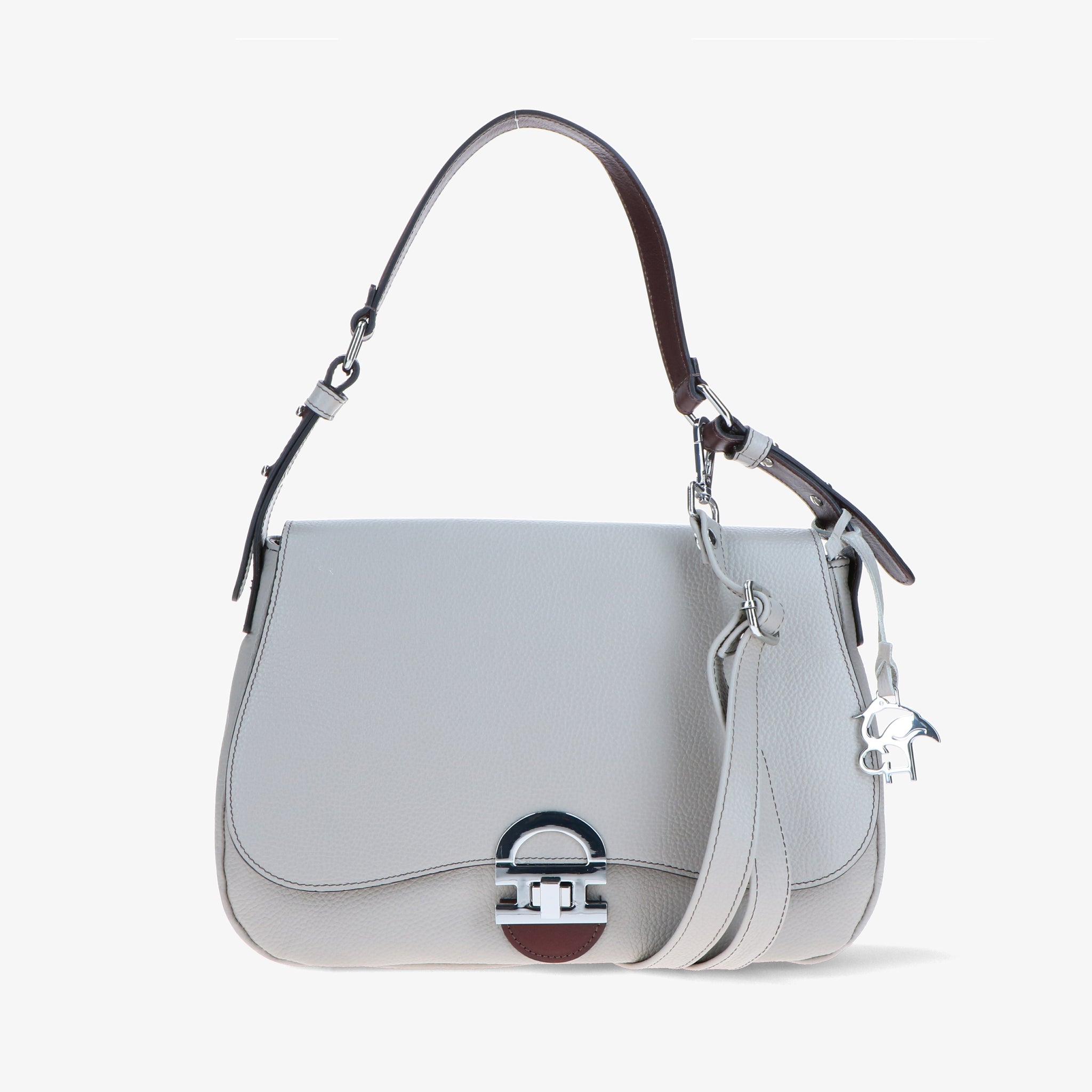 Shoulder bag crafted from hammered leather, with a natural grain and soft touch, enhanced by leather trims that create an elegant chromatic contrast.