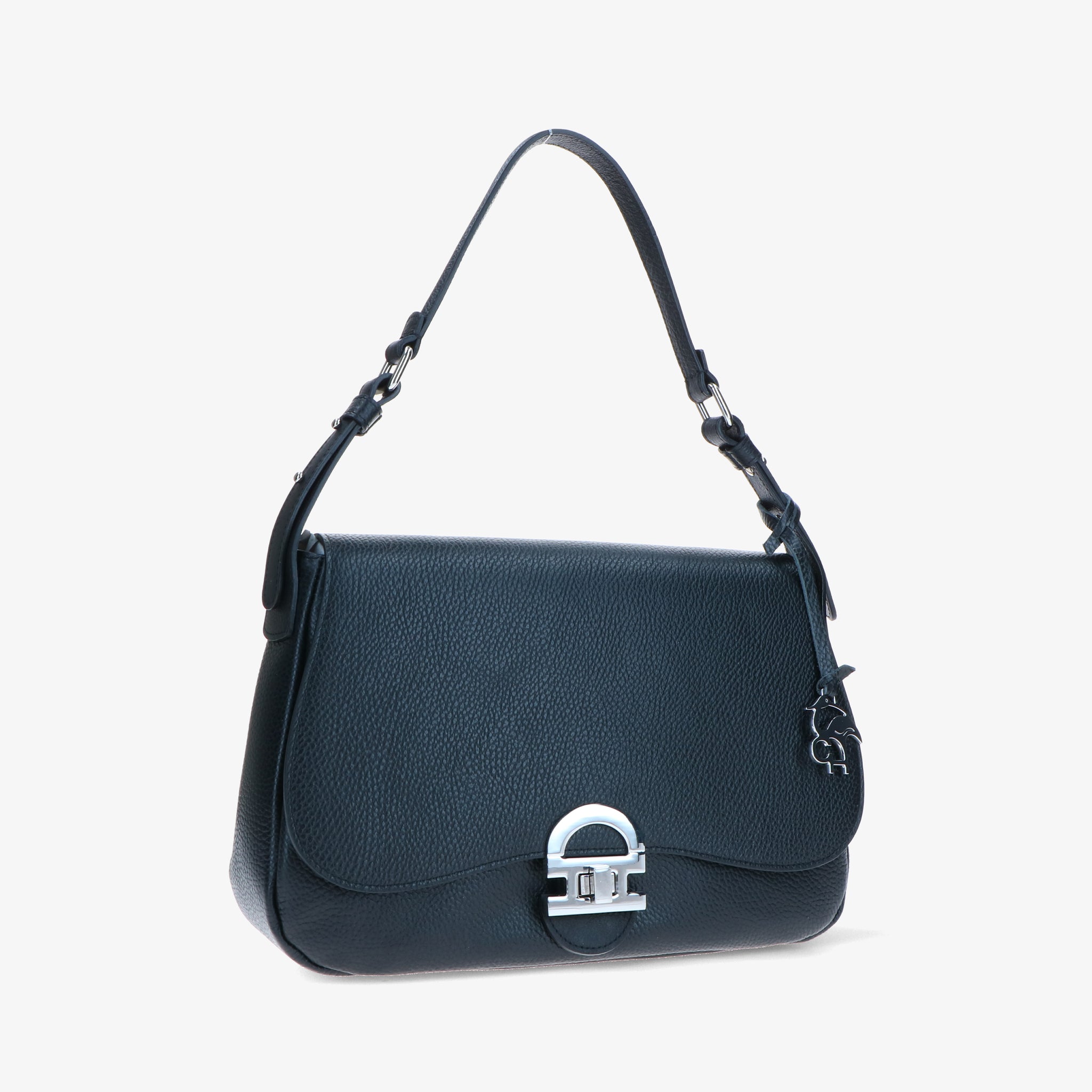 The flap with front closure is defined by the iconic CH accessory, a distinctive detail that adds character to the design. The lined interior is organized with pockets for practical item management, while the zip pocket on the back adds discreet functionality.