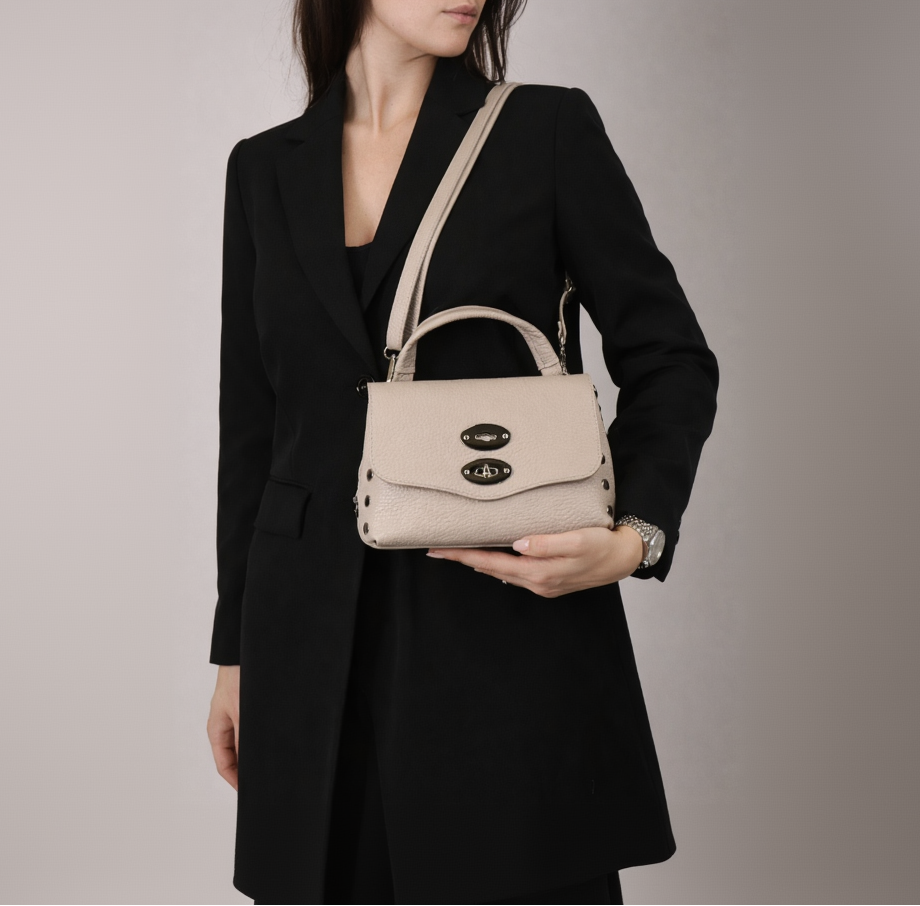 Borsa a mano in pelle martellata, dal carattere deciso e contemporaneo. Il design essenziale è valorizzato da accessori in metallo argentato, che donano luce e personalità. Compatta e funzionale, è dotata di manico superiore e tracolla rimovibile per essere indossata a mano, a spalla o crossbody. Una borsa grintosa ed elegante, pensata per distinguersi con stile.