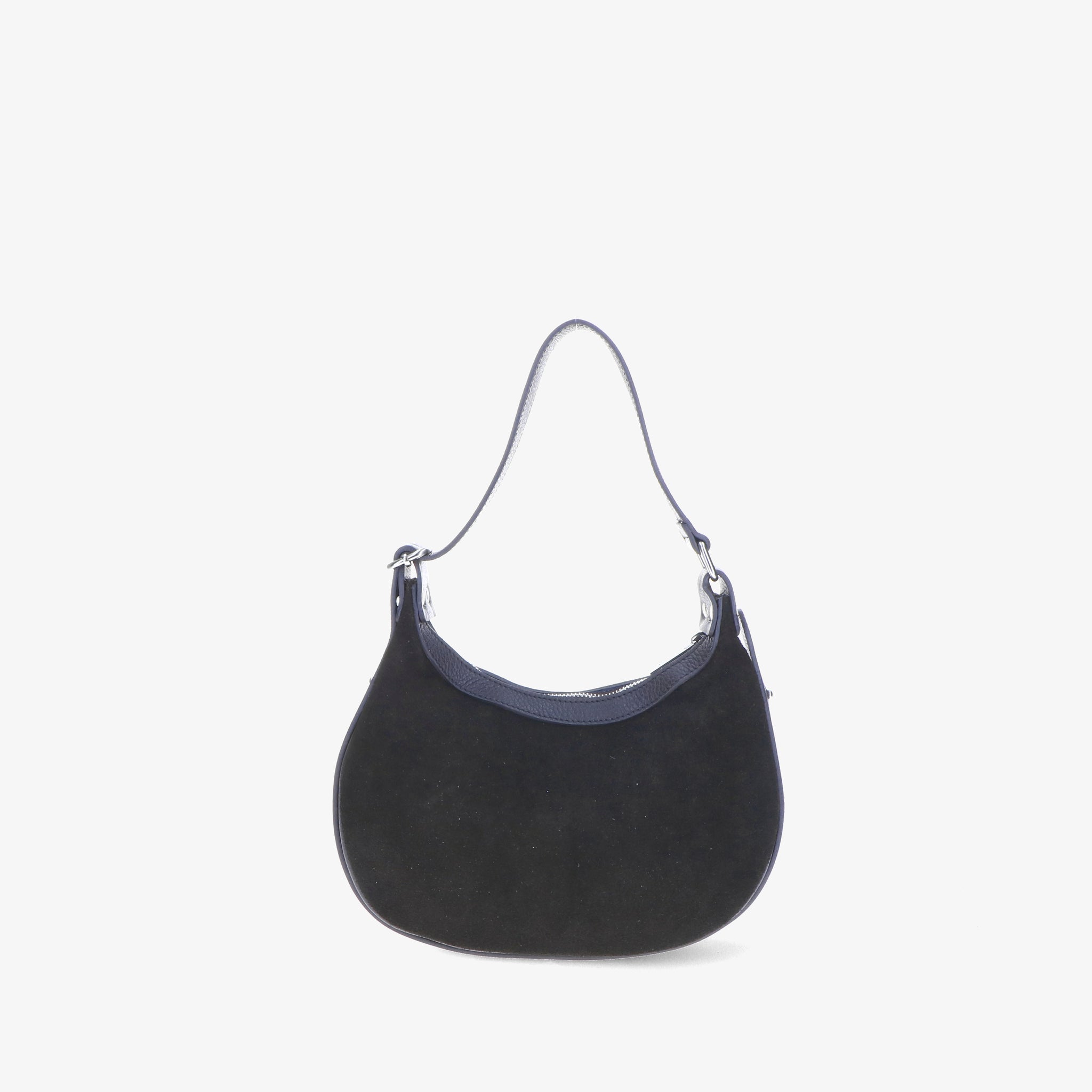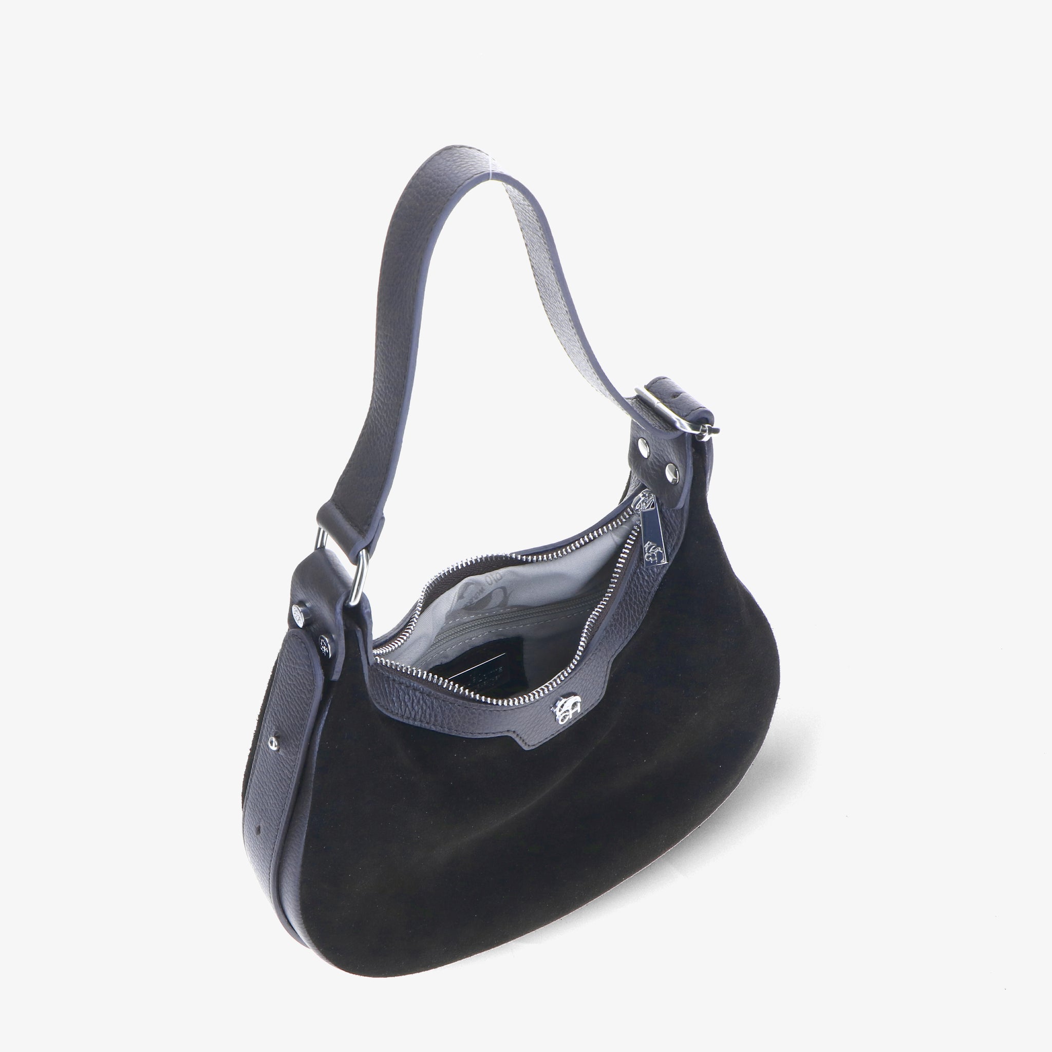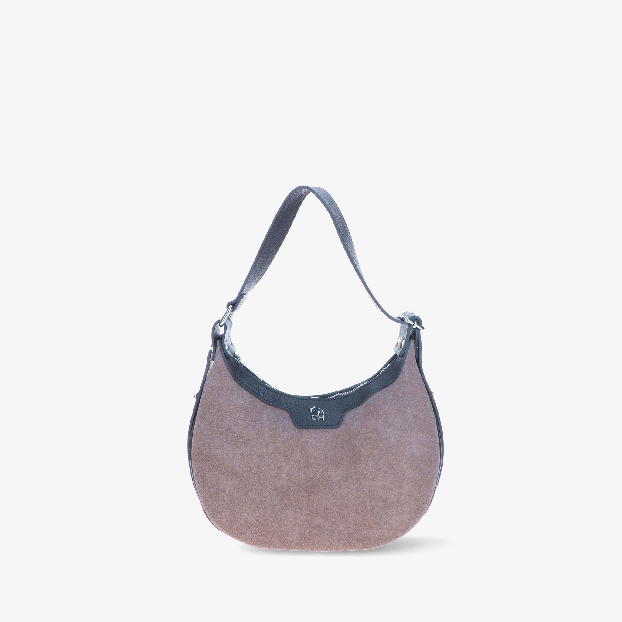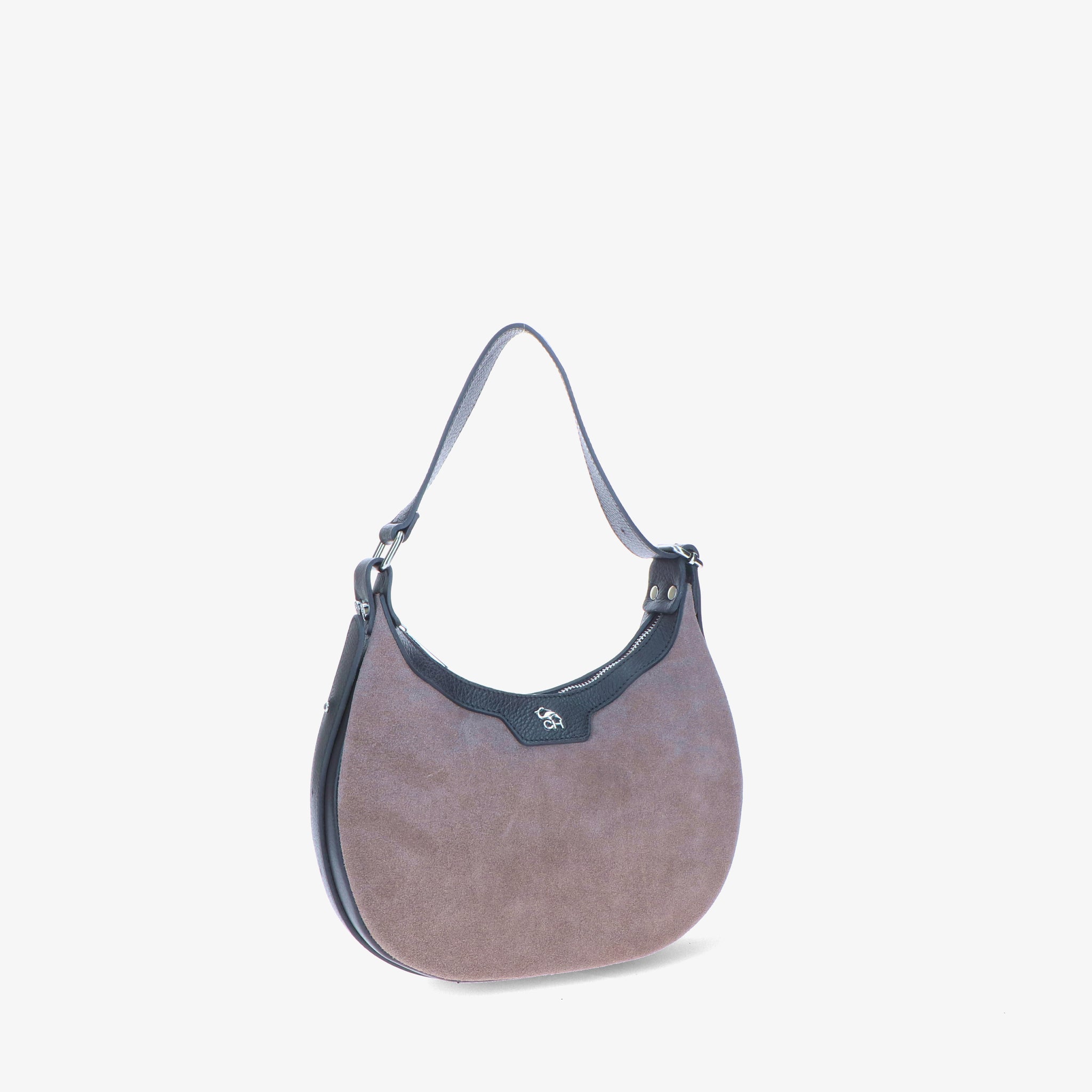 Borsa a spalla, realizzata in morbido camoscio abbinato a pelle martellata, per un contrasto materico raffinato e contemporaneo. La silhouette a mezzaluna è essenziale e armoniosa, caratterizzata da un profilo pulito e da una chiusura con zip. La tracolla regolabile, dotata di fibbia laterale con fori, permette di adattare facilmente la portata, rendendo la borsa confortevole e versatile in ogni occasione. L’interno foderato con tasche offre la giusta organizzazione per l’uso quotidiano.