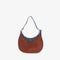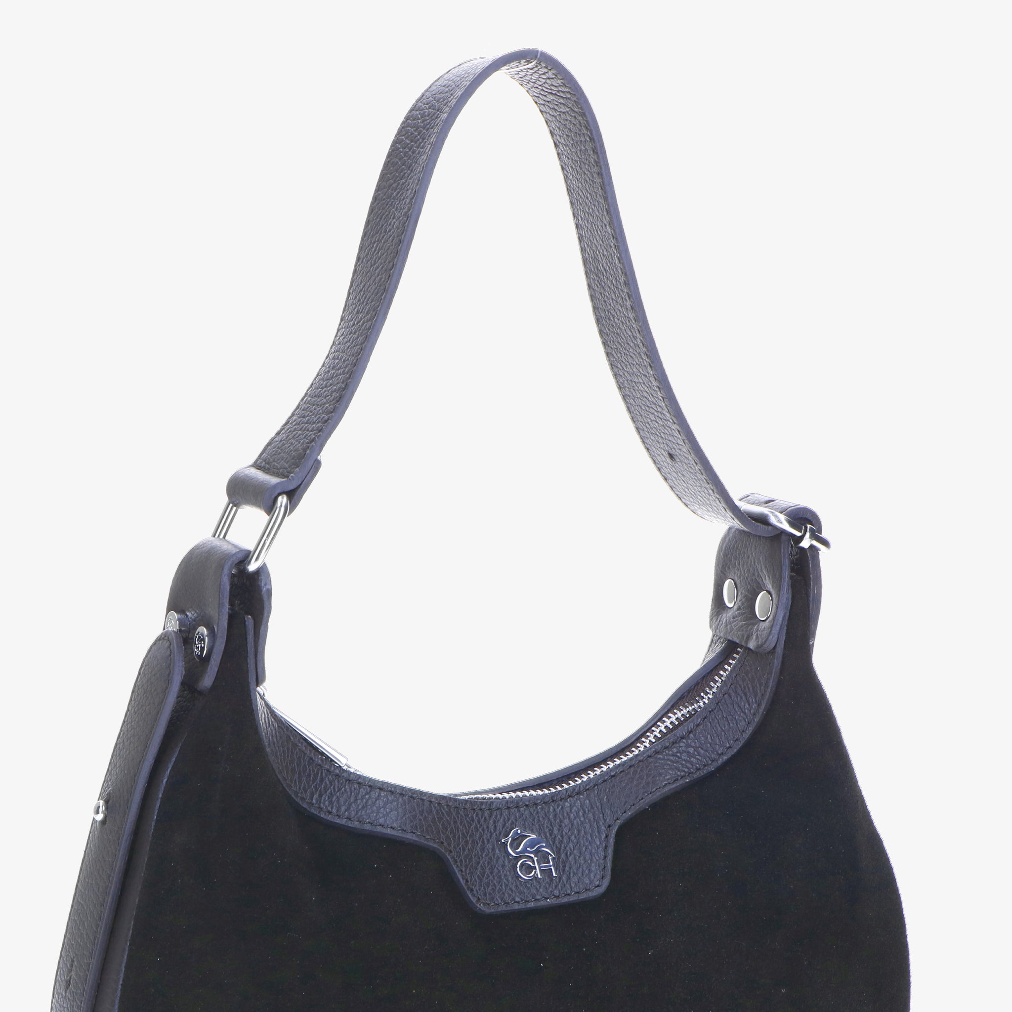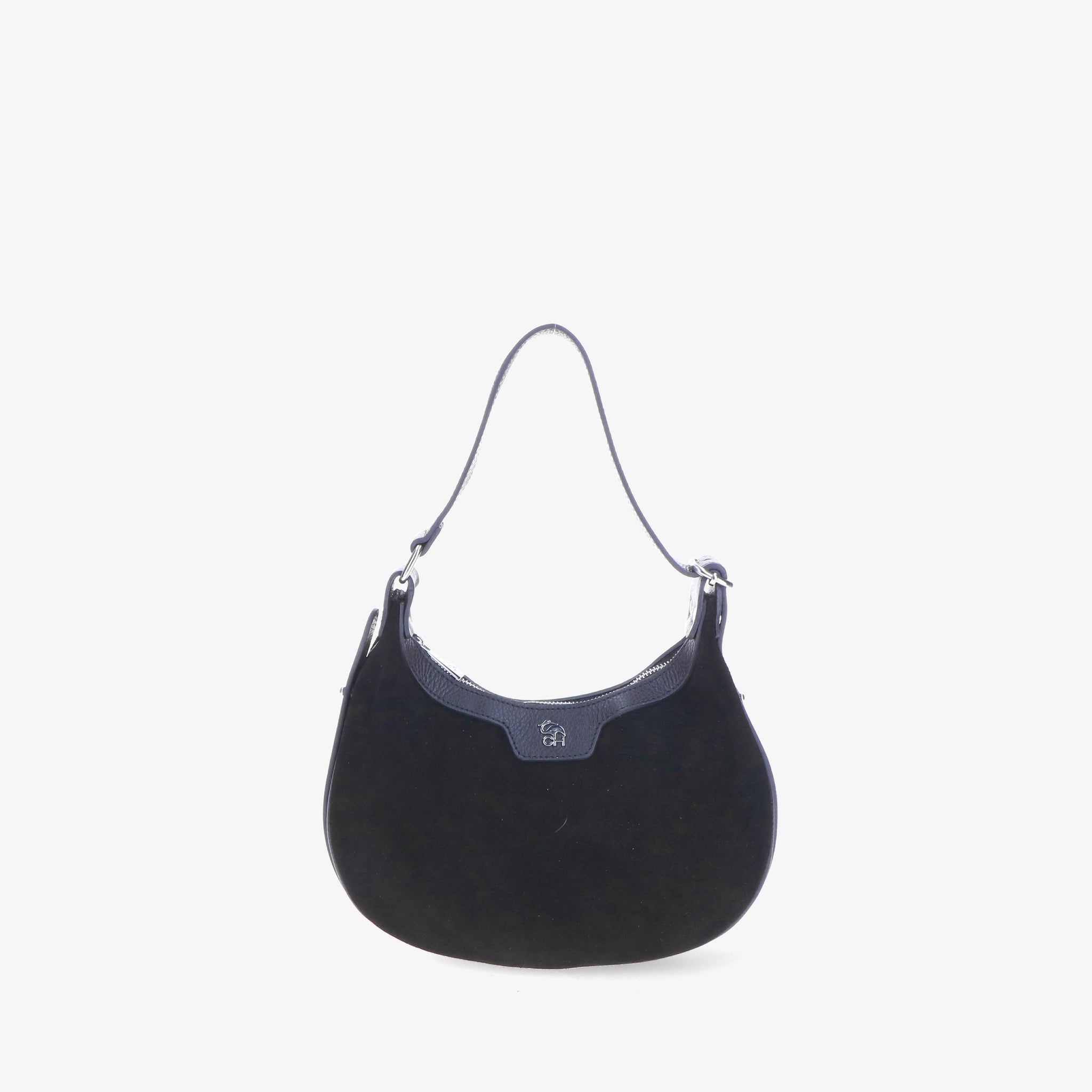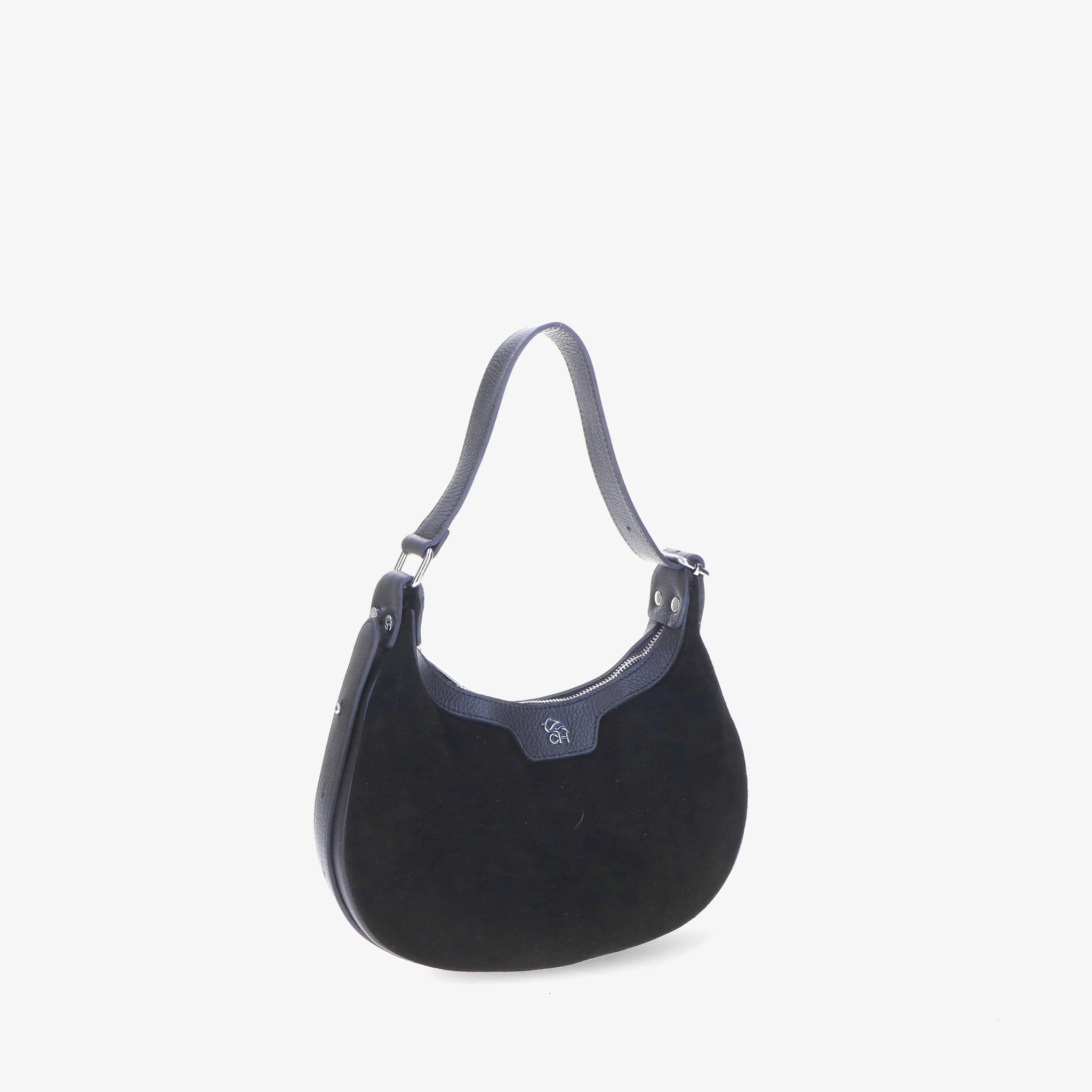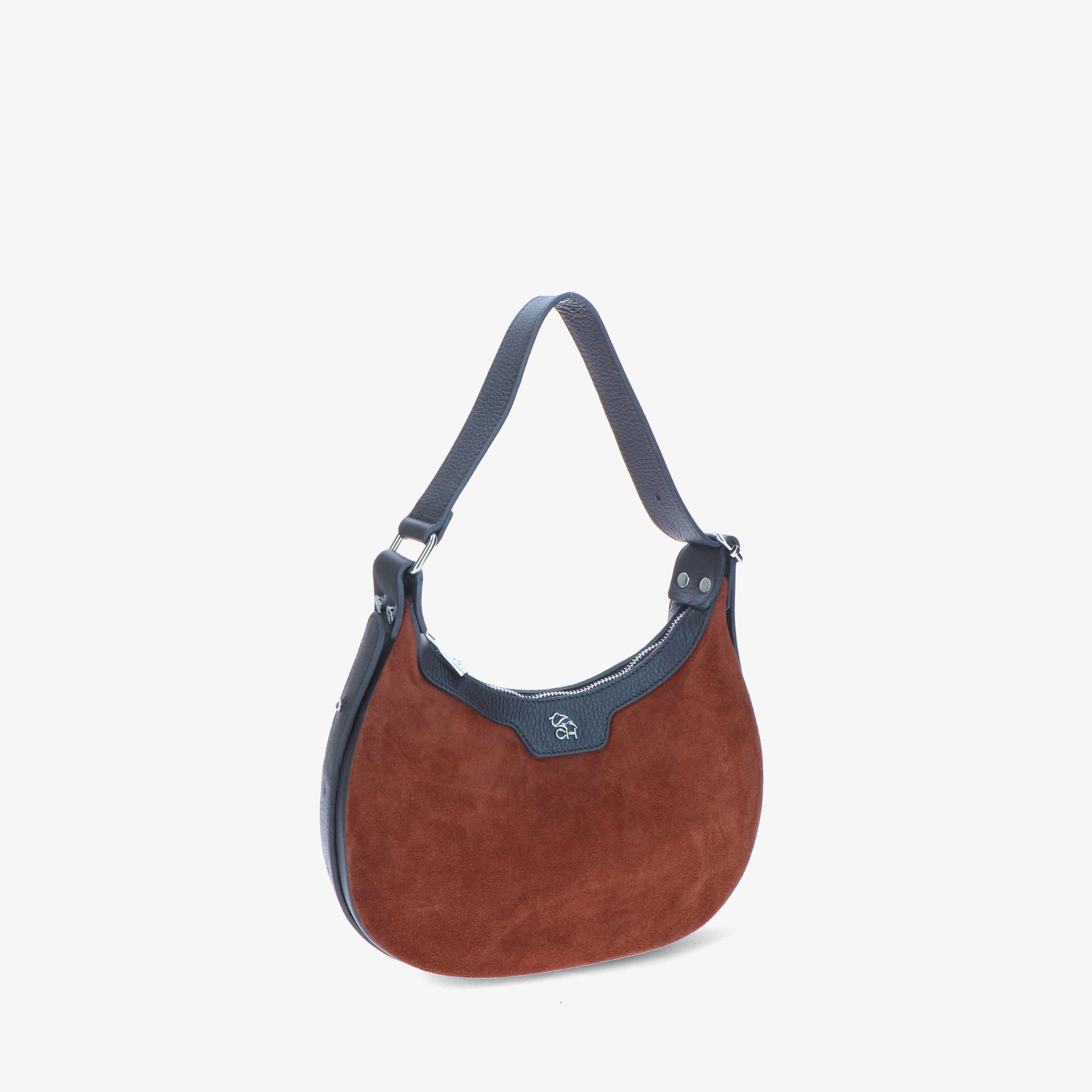 Borsa a spalla, realizzata in morbido camoscio abbinato a pelle martellata, per un contrasto materico raffinato e contemporaneo. La silhouette a mezzaluna è essenziale e armoniosa, caratterizzata da un profilo pulito e da una chiusura con zip. La tracolla regolabile, dotata di fibbia laterale con fori, permette di adattare facilmente la portata, rendendo la borsa confortevole e versatile in ogni occasione. L’interno foderato con tasche offre la giusta organizzazione per l’uso quotidiano.